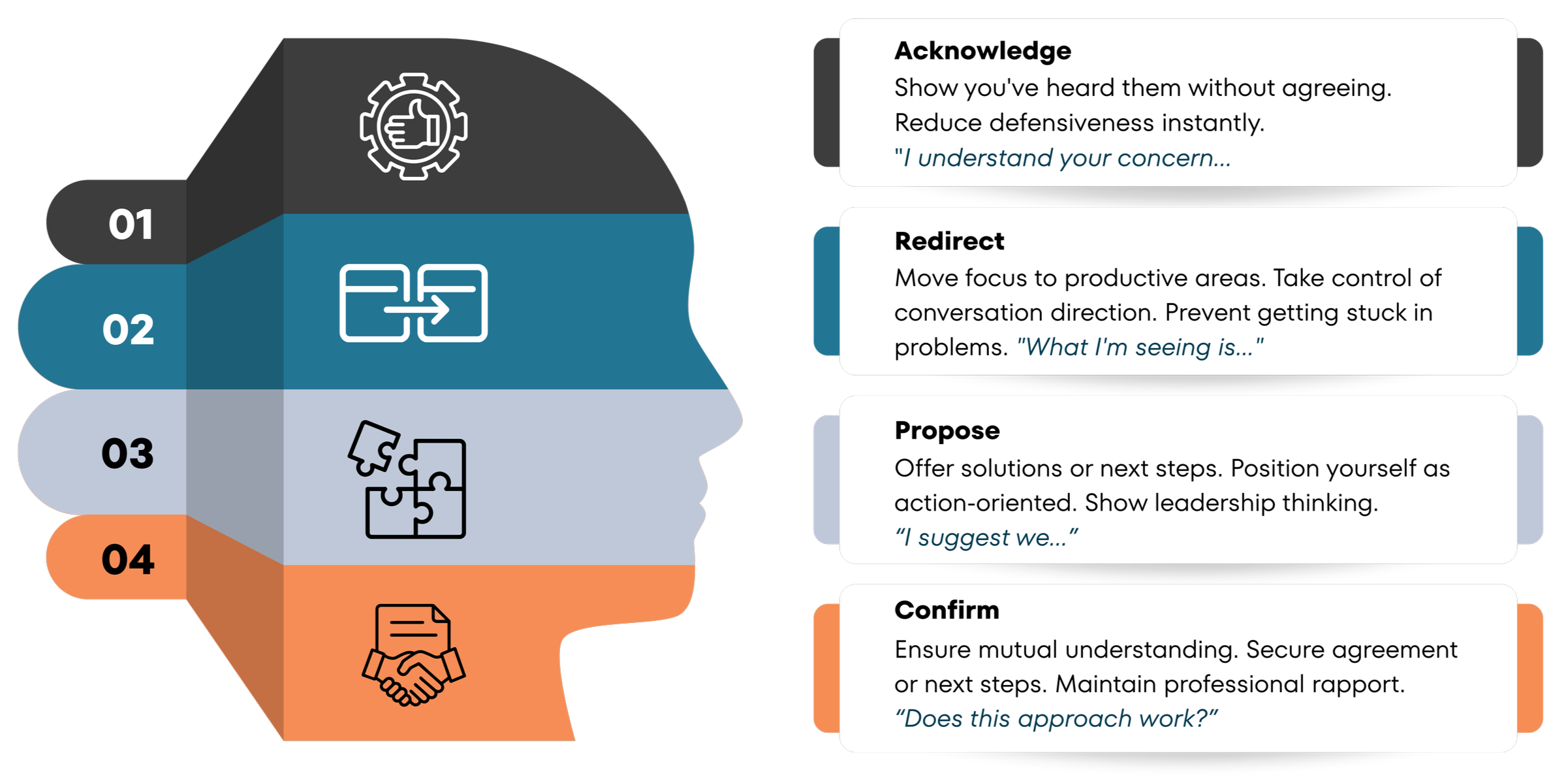 Learn the proven 4-Step Response System for high-pressure moments: Acknowledge, Redirect, Propose, Confirm. Approach every challenging conversations with confidence..