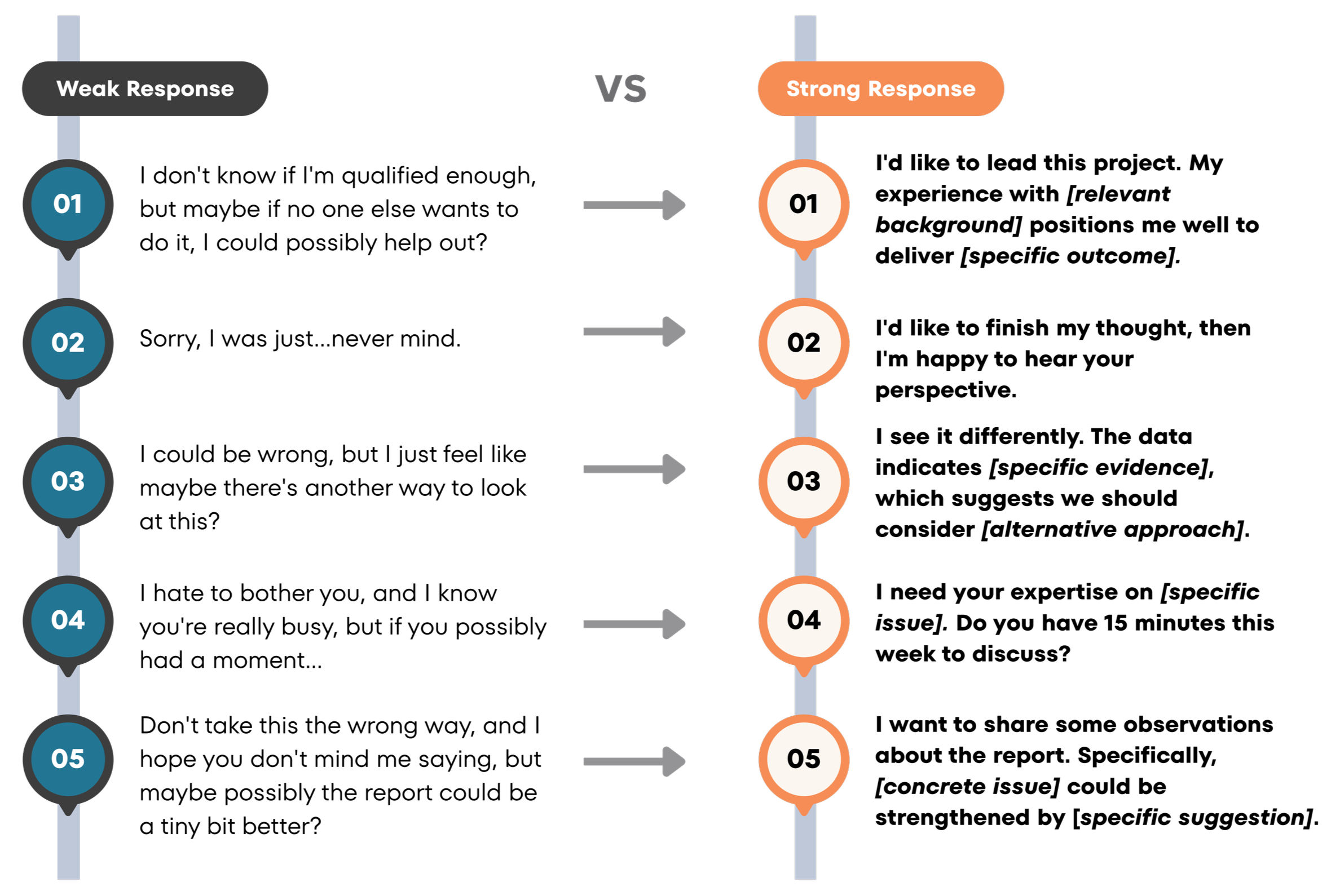 Master the core principle that transforms workplace interactions: you control every conversation. Learn the tactical difference between weak phrases that undermine credibility and power phrases that command instant respect.